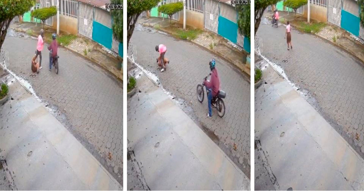 La mujer intentó resistirse, pero el asaltante la empujó bruscamente y la derribó al pavimento, logrando despojarla de sus objetos de valor. Después, abordó nuevamente la motocicleta y escapó junto a su cómplice, mientras la víctima quedó tendida en plena vía.
