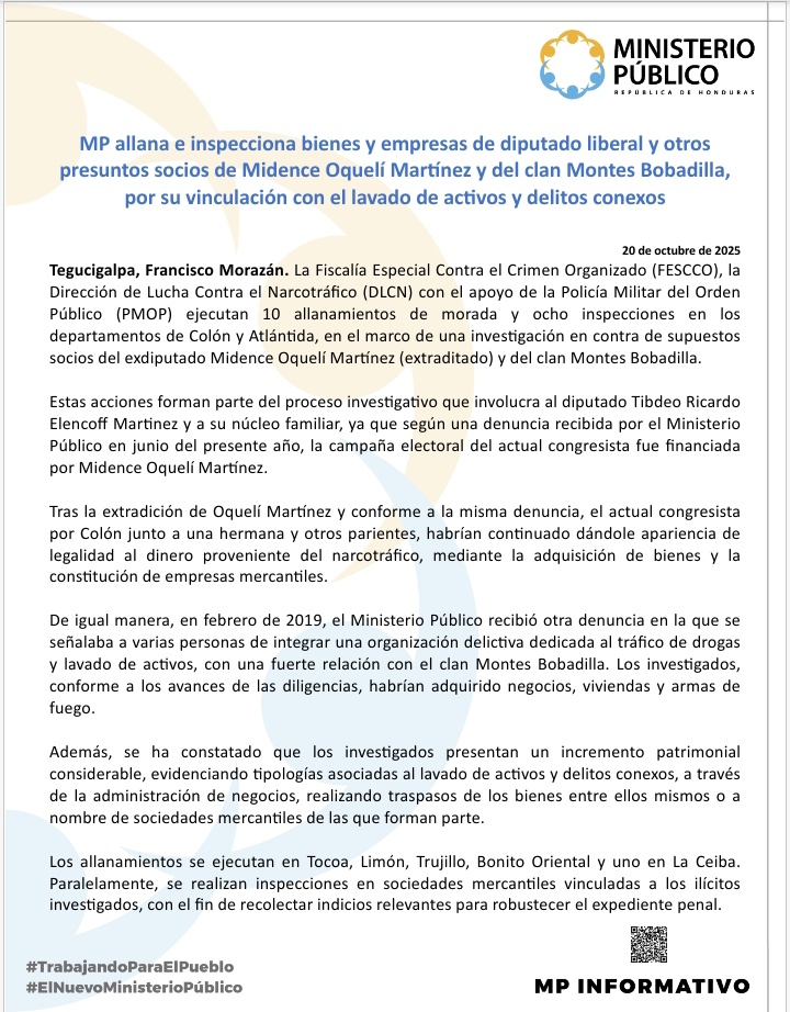 Como parte del proceso, la Fiscalía Especial Contra el Crimen Organizado (FESCCO) y la Dirección de Lucha Contra el Narcotráfico (DLCN), con apoyo de la Policía Militar del Orden Público (PMOP), ejecutaron este lunes diez allanamientos de morada y ocho inspecciones a empresas vinculadas al legislador y a presuntos socios de Midence Oquelí Martínez y del clan Montes Bobadilla.