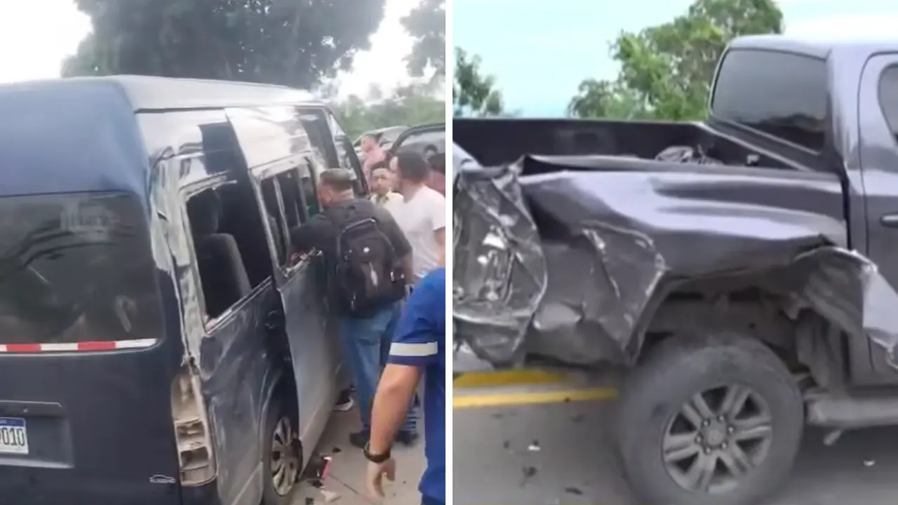 El choque ocurrió alrededor de las 4:00 p.m., cuando el bus, que acababa de recoger a un grupo de viajeros procedentes de vuelos internacionales, colisionó frontalmente con la pick-up.