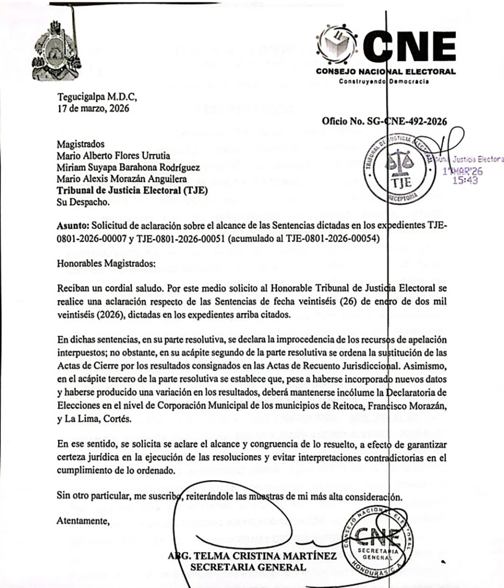 El Consejo Nacional Electoral envió un oficio oficial al Tribunal de Justicia Electoral solicitando precisiones sobre el alcance de las sentencias emitidas el 26 de enero de 2026, referentes a los procesos electorales en los municipios de Reitoca, Francisco Morazán, y La Lima, Cortés.