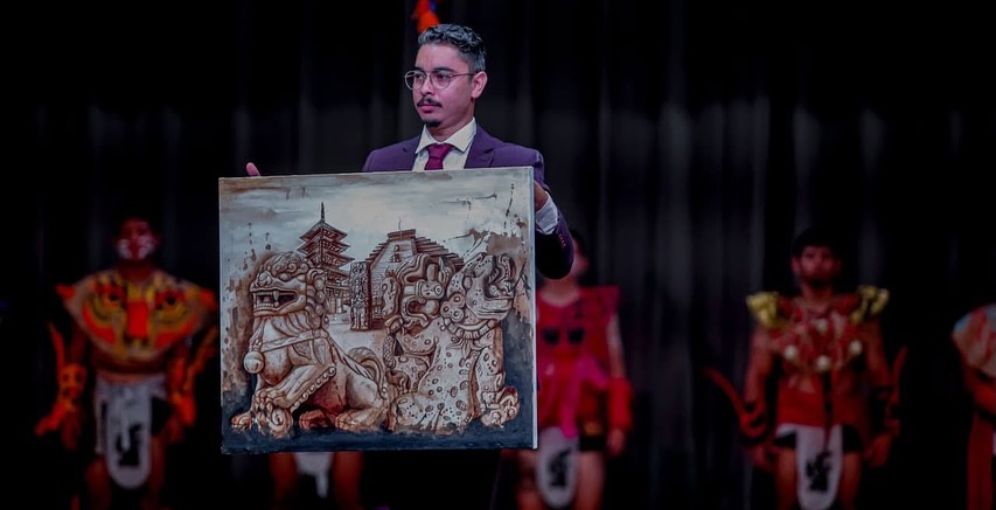 A través de sus redes sociales, el pintor explicó que la pieza representa “el encuentro simbólico entre las selvas del tiempo y los templos del silencio, donde dos mundos que jamás se tocaron comparten una misma verdad”.
