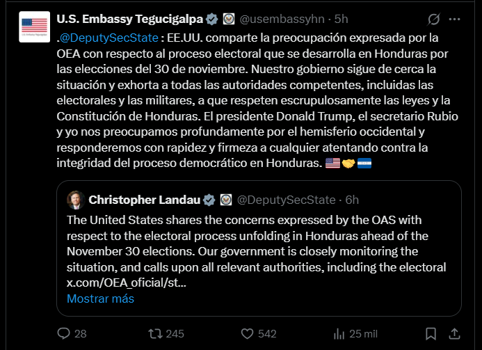 Además, el comunicado destaca que el presidente Donald Trump, el secretario Rubio y el subsecretario Christopher Landau están “profundamente preocupados” por la estabilidad democrática en el hemisferio occidental. La embajada advirtió que Estados Unidos responderá “con rapidez y firmeza” ante cualquier intento de socavar la integridad del proceso democrático en Honduras.