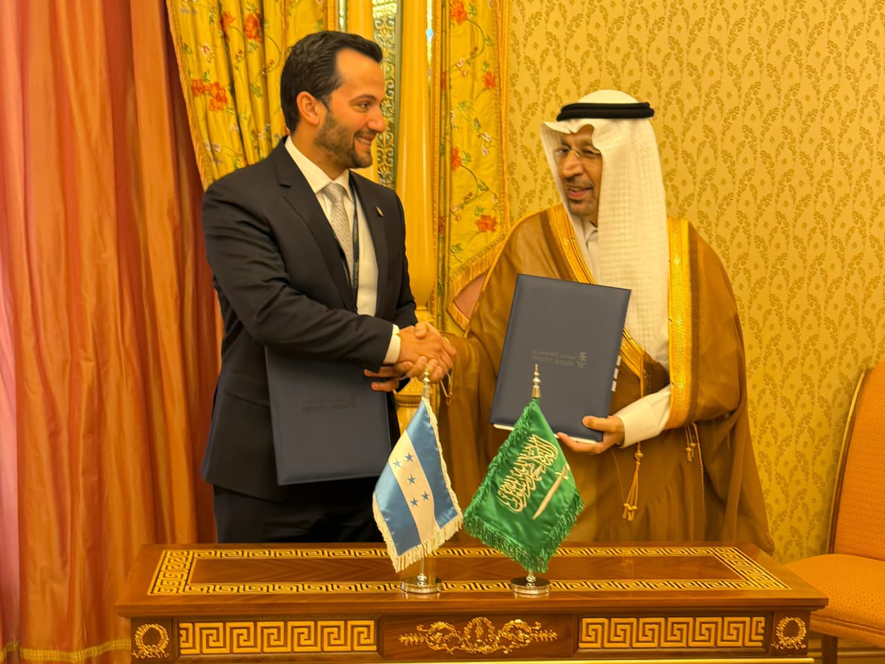 La firma estuvo encabezada por el ministro de Inversiones de Honduras, Miguel Medina, y su homólogo saudí, Su Excelencia el Ing. Khalid bin Abdulaziz Al-Falih, marcando un paso decisivo hacia una relación más dinámica y estratégica entre ambos países.