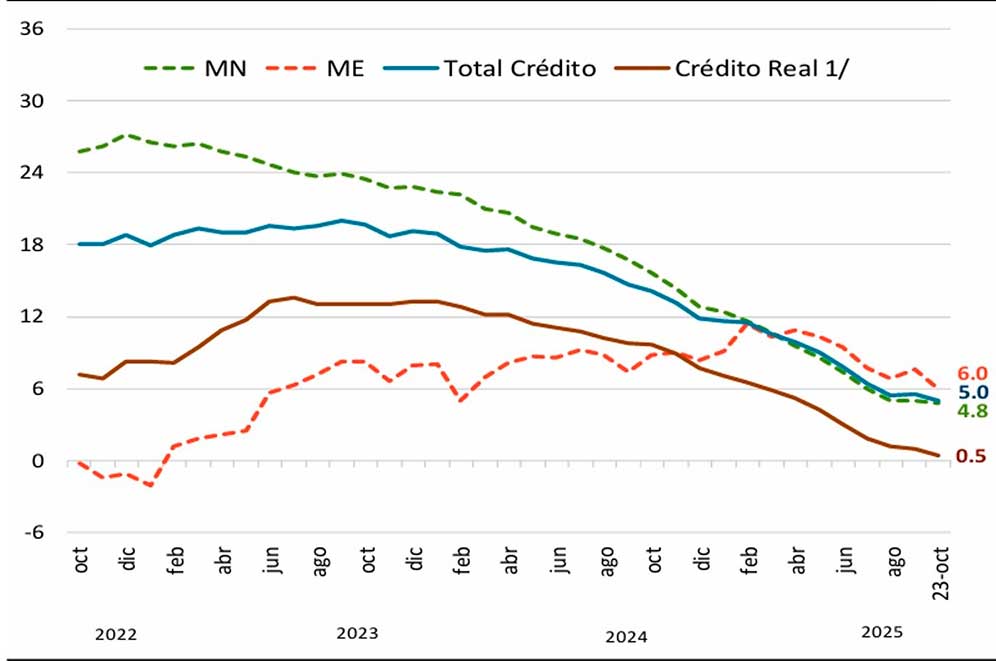 El saldo del crédito al sector privado al 23 de octubre de 2025 fue de 661,922.4 millones de lempiras, superior en 14,900.9 millones (2.3%), respecto al cierre de 2024; comportamiento liderado por el crédito a los hogares. Asimismo, del total, el 78.7 por ciento está constituido en moneda nacional.