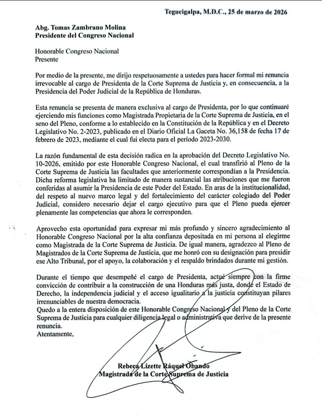 El Congreso Nacional de Honduras recibió la renuncia oficial de Rebeca Ráquel Obando a la presidencia de la Corte Suprema de Justicia de Honduras, decisión que quedó consignada en un documento presentado el 25 de marzo.