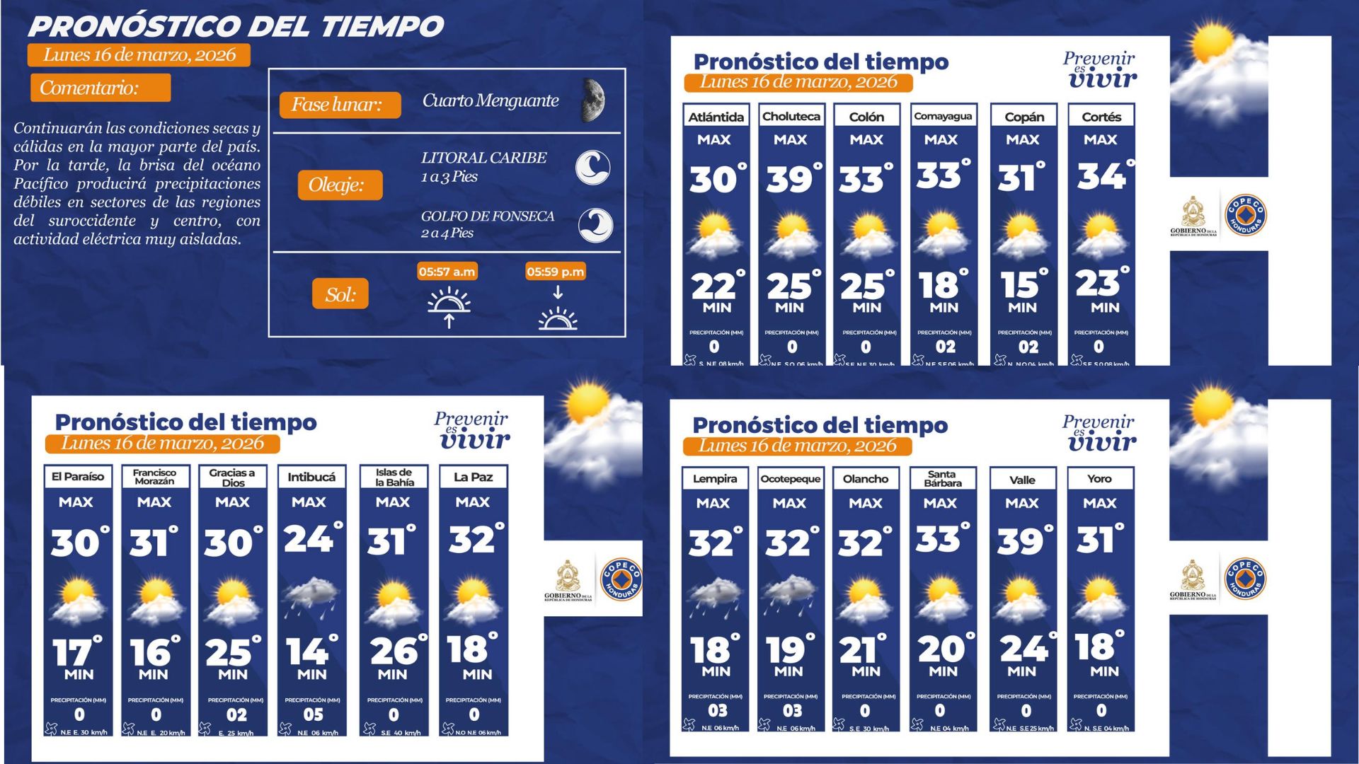 Para este lunes 16 de marzo de 2026, las autoridades de la Secretaría de Gestión de Riesgos y Contingencias Nacionales (COPECO) informaron que gran parte del territorio hondureño continuará experimentando condiciones climáticas secas y ambiente cálido.