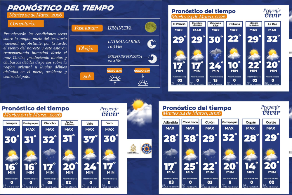 Las condiciones climáticas para este martes estarán dominadas por un ambiente seco en gran parte del país, según informó la COPECO, autoridad encargada de monitorear el estado del tiempo y gestionar riesgos.