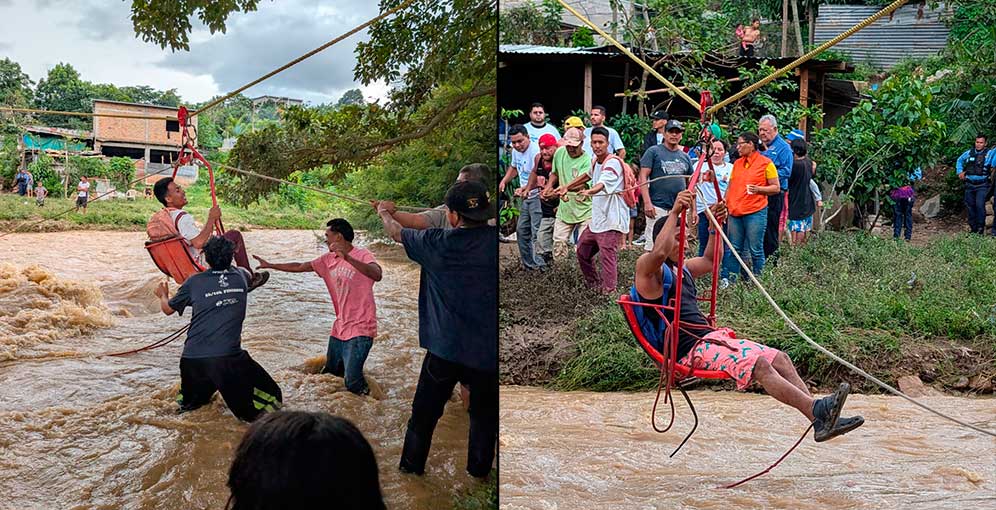La situación obligó a los pobladores a improvisar una garrucha con lazos y una silla, para cruzar la fuerte corriente, arriesgando sus vidas en cada intento.