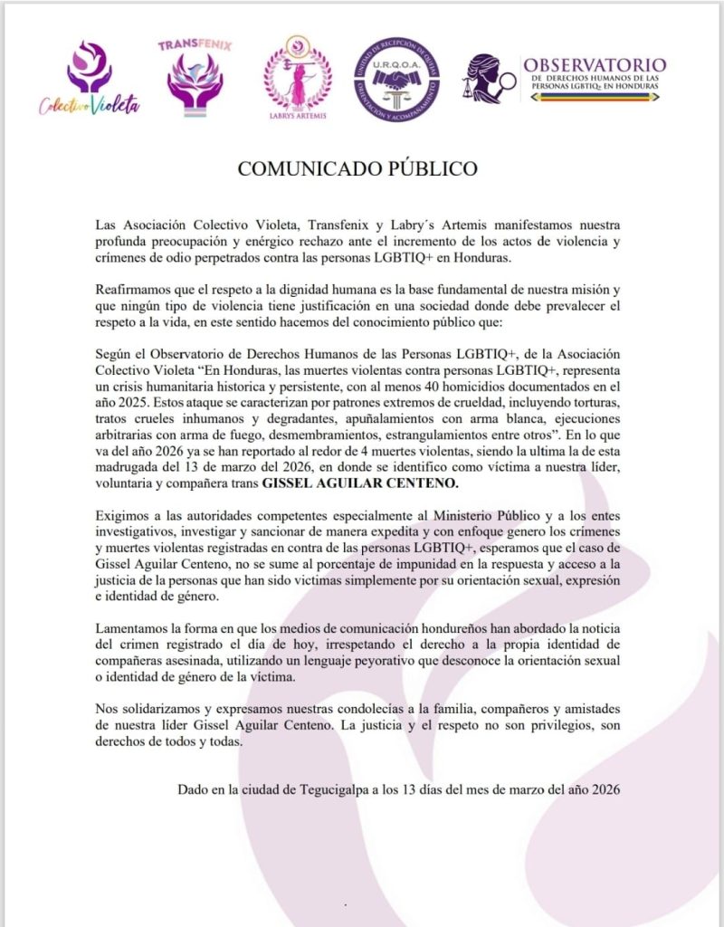 “Exigimos investigar y sancionar de manera expedita los crímenes y muertes violentas registradas contra las personas LGBTIQ+. Esperamos que el caso de Giseel Aguilar Centeno no se sume al porcentaje de impunidad”, concluye el comunicado.