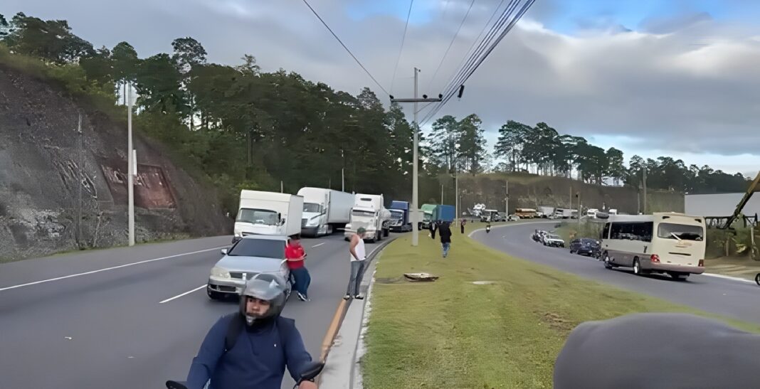 Los conductores y propietarios de unidades de transporte han colocado camiones y autobuses a lo largo de la vía, impidiendo el paso vehicular en ambos sentidos.