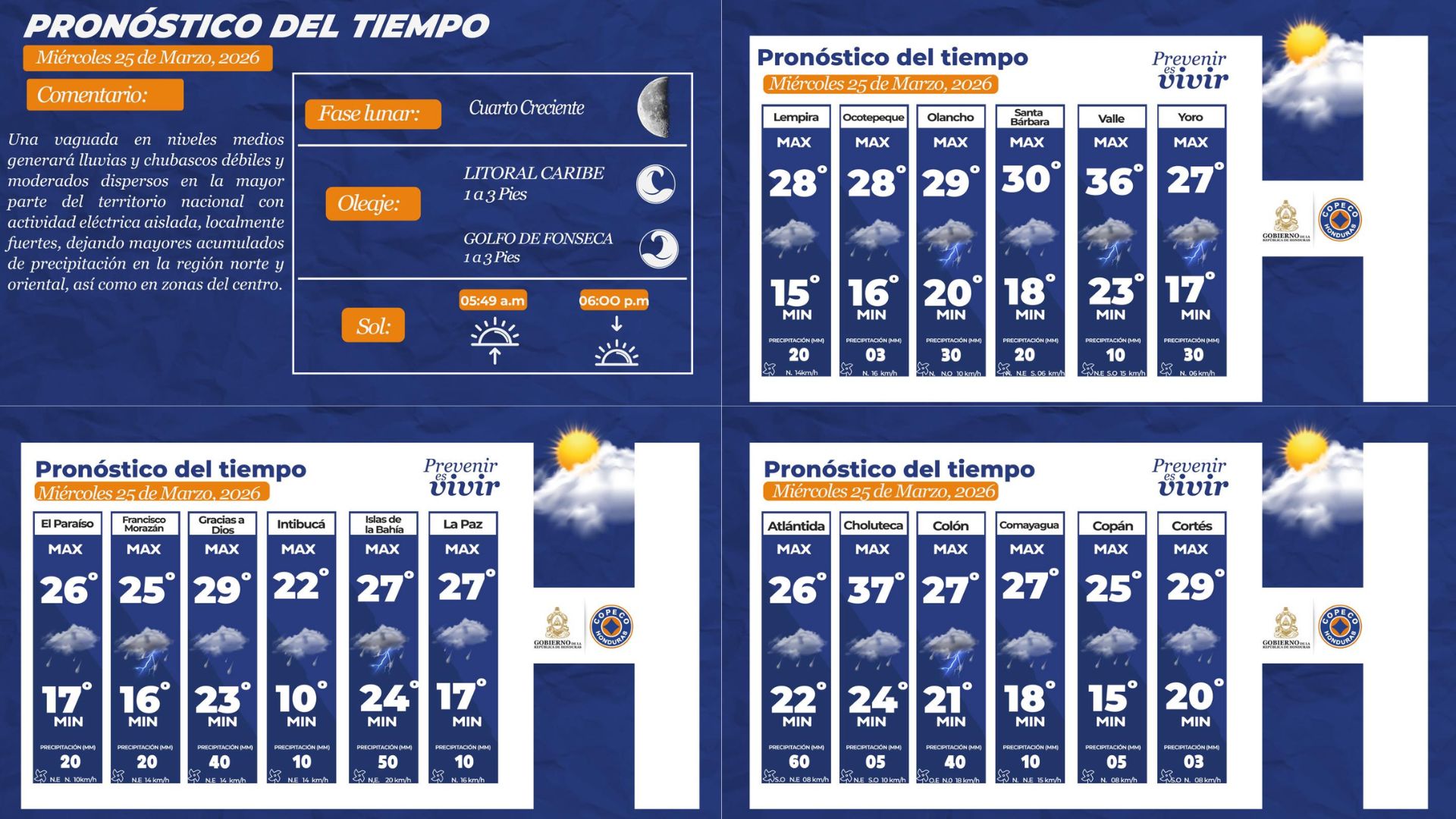 COPECO informó que para este miércoles se prevé un cambio en las condiciones del clima, con la presencia de una vaguada que generará precipitaciones en distintas regiones del país.
