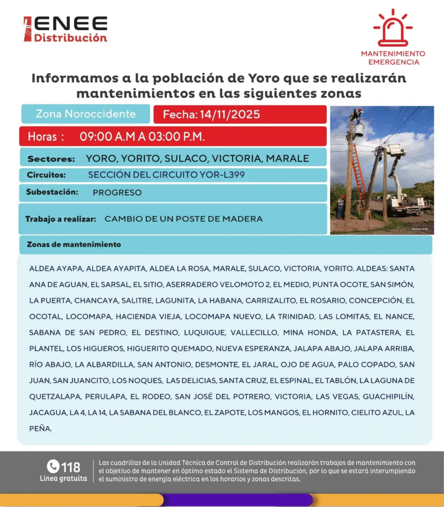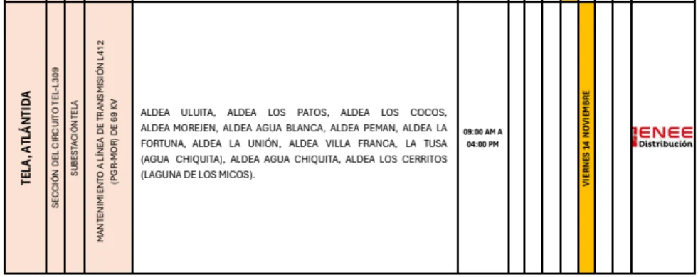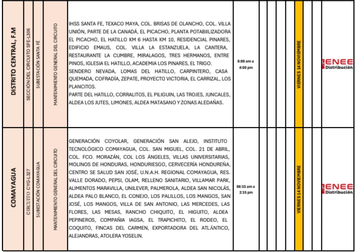 La Empresa Nacional de Energía Eléctrica (ENEE) informó que este viernes 14 de noviembre se realizarán interrupciones programadas del servicio eléctrico en varias zonas del país. Según el calendario semanal publicado por la institución, los cortes afectarán a los municipios de Distrito Central, Comayagua, Tela, Atlántida, Yoro, Yorito, Sulaco, Victoria y Marale.